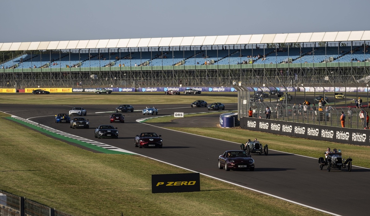 Anlässlich des 110-jährigen Jubiläums von Aston Martin drehten 110 Fahrzeuge der Marke in Silverstone eine Ehrenrunde. Noch nie waren so viele Aston Martins gleichzeitig auf der Strecke.