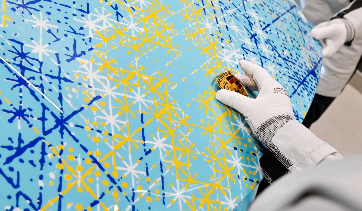 Im Rahmen des Sonderwunsch-Programms von Porsche entstand ein außergewöhnliches Fahrzeug auf Basis des Taycan Turbo S. Sowohl außen auf der Karosserie als auch im Interieur der Sportlimousine finden sich Ausschnitte von Ding Yis Gemälde 'Appearance of Crosses 2022-2'.